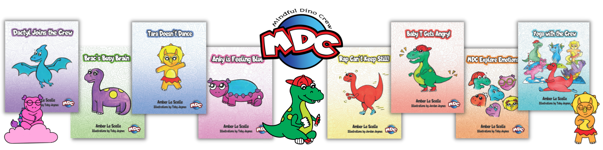 Meet the Mindful Dino CrewDinosaur friends teaching mindfulness and yoga to kids!Read the books and follow along! Baby T Rap Dactyl Tara Brac Anky Yoga with the Crew Explore Emotions